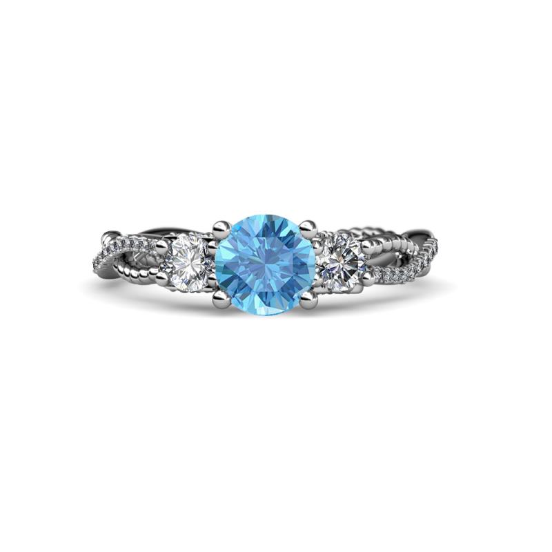 Three Stone Engagement Ring represents the promise to love in past, present and future. A Center Blue Topaz is flanked by Round Diamond with pave loop swirl undergallery Diamonds along with alternating cross over row Pave Set Diamonds lavaliere shank create a dazzling appearance Present it to her and showcase eternal love.