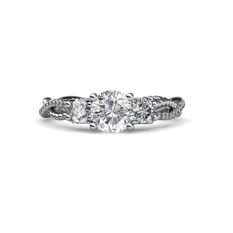 Three Stone Engagement Ring represents the promise to love in past, present and future. A Center Diamond is flanked by Round Diamond with pave loop swirl undergallery Diamonds along with alternating cross over row Pave Set Diamonds lavaliere shank create a dazzling appearance Present it to her and showcase eternal love.