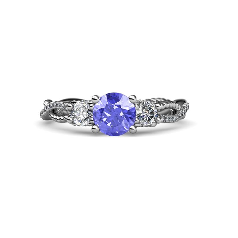 Three Stone Engagement Ring represents the promise to love in past, present and future. A Center Tanzanite is flanked by Round Diamond with pave loop swirl undergallery Diamonds along with alternating cross over row Pave Set Diamonds lavaliere shank create a dazzling appearance Present it to her and showcase eternal love.