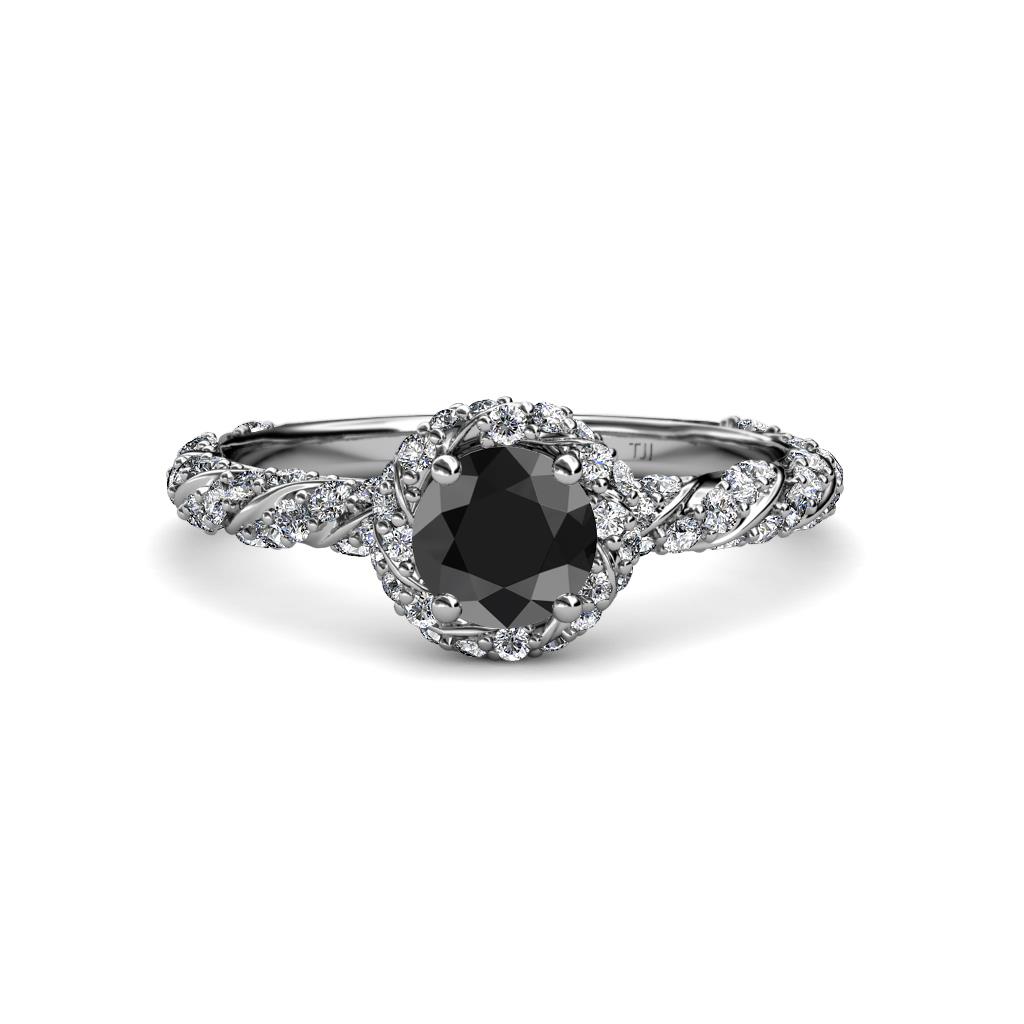 Express Your love and ask her to be yours forever with this exquisite Halo Engagement Ring featuring Center Black Diamond in a 4 Prong Setting with Halo of single row Pave Set Diamonds overlapping by swirl rope single row Pave Shank.