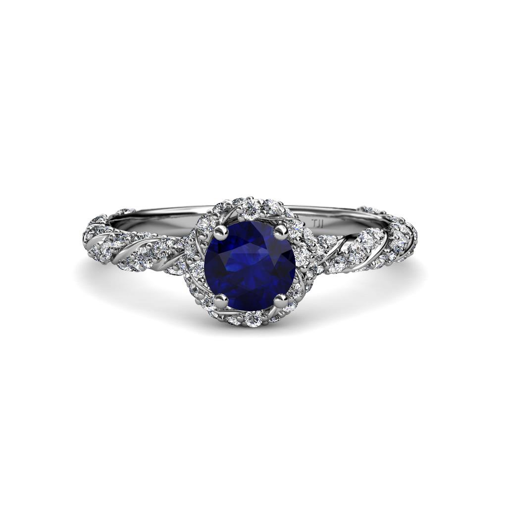 Express Your love and ask her to be yours forever with this exquisite Halo Engagement Ring featuring Center Blue Sapphire in a 4 Prong Setting with Halo of single row Pave Set Diamonds overlapping by swirl rope single row Pave Shank.