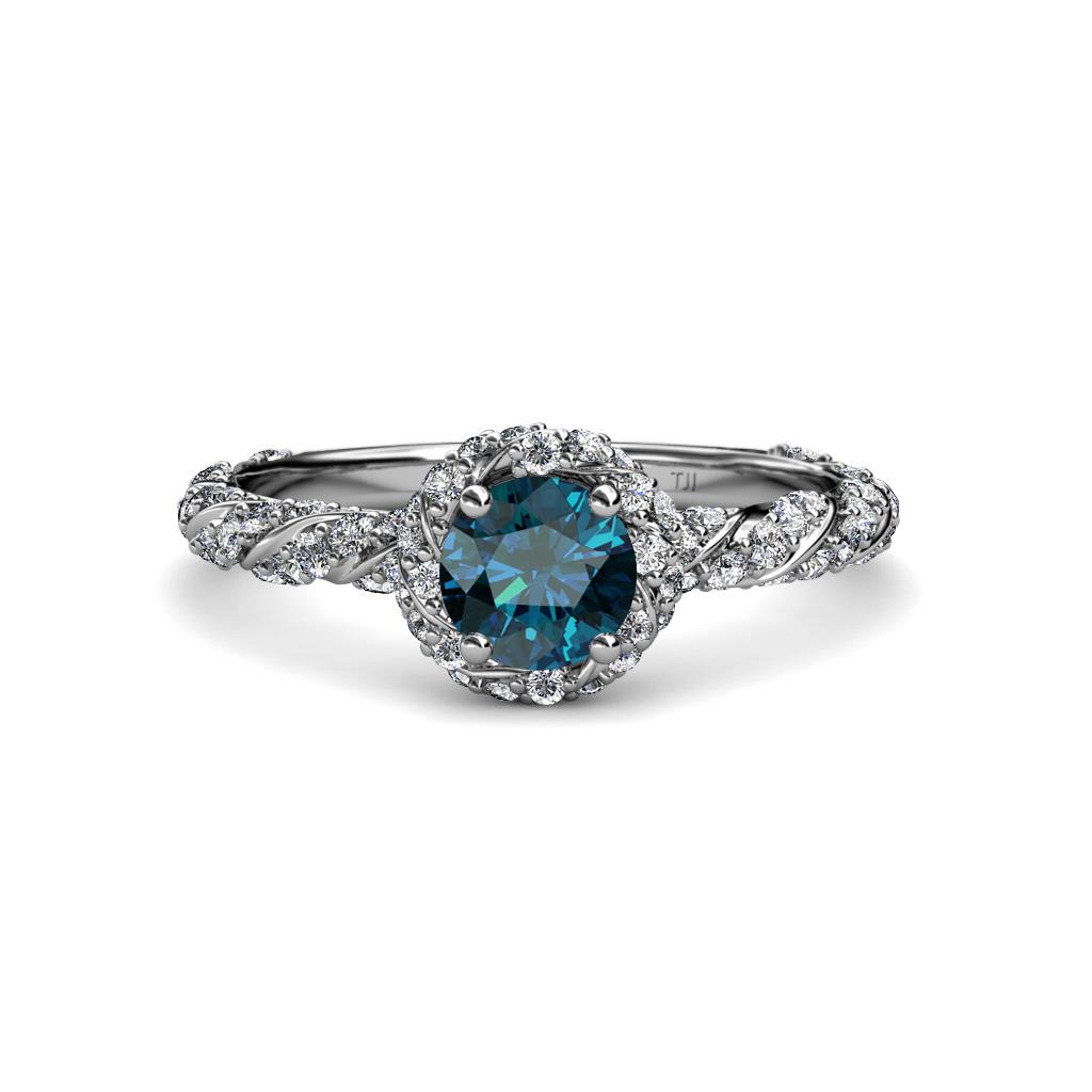 Express Your love and ask her to be yours forever with this exquisite Halo Engagement Ring featuring Center Blue Diamond in a 4 Prong Setting with Halo of single row Pave Set Diamonds overlapping by swirl rope single row Pave Shank.