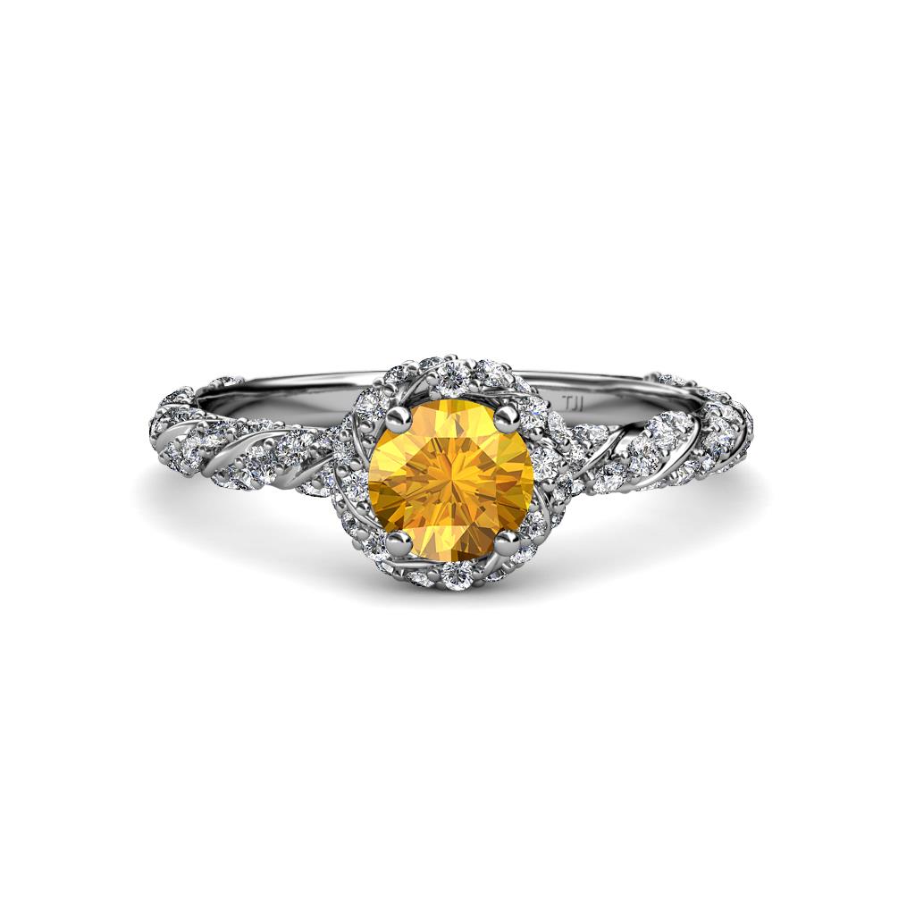 Express Your love and ask her to be yours forever with this exquisite Halo Engagement Ring featuring Center Citrine in a 4 Prong Setting with Halo of single row Pave Set Diamonds overlapping by swirl rope single row Pave Shank.