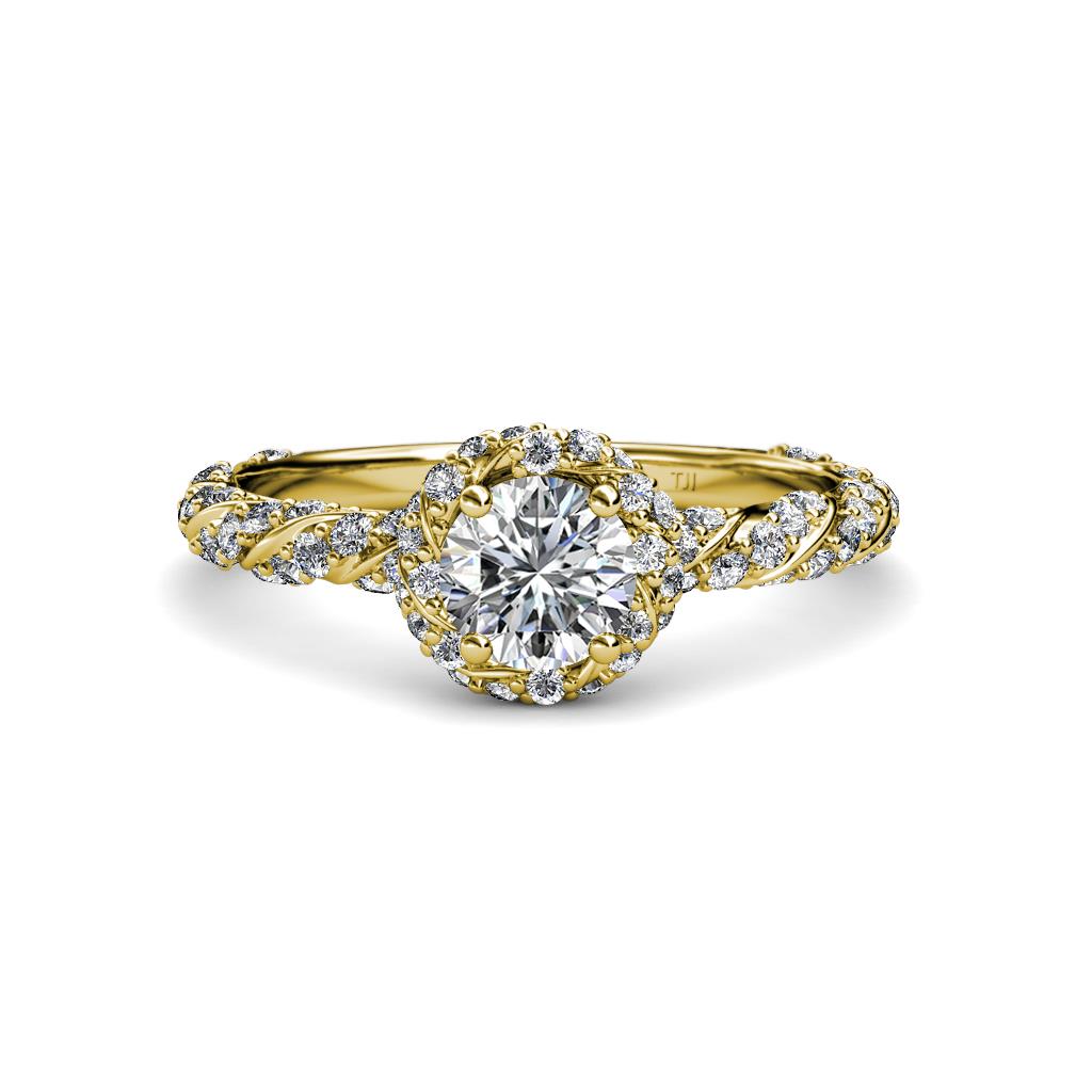 Express Your love and ask her to be yours forever with this exquisite Halo Engagement Ring featuring Center Diamond in a 4 Prong Setting with Halo of single row Pave Set Diamonds overlapping by swirl rope single row Pave Shank.