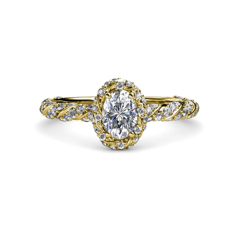 Express Your love and ask her to be yours forever with this exquisite Halo Engagement Ring of 1.33 ctw featuring Center Oval Shape IGI Certified Lab Grown Diamond in a 4 Prong Setting with Halo of single row Pave Set Natural Diamonds overlapping by swirl rope single row Pave Shank.