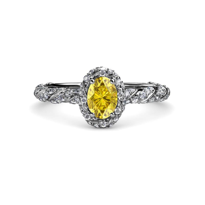 Express Your love and ask her to be yours forever with this exquisite Halo Engagement Ring featuring Center Oval Shape Yellow Sapphire in a 4 Prong Setting with Halo of single row Pave Set Diamonds overlapping by swirl rope single row Pave Shank.