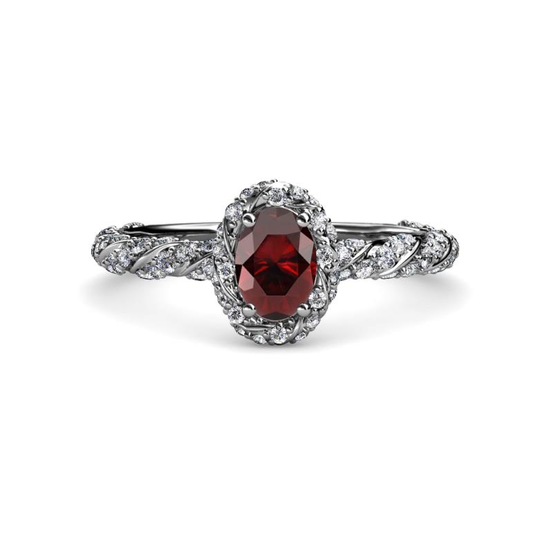 Express Your love and ask her to be yours forever with this exquisite Halo Engagement Ring featuring Center Oval Shape Red Garnet in a 4 Prong Setting with Halo of single row Pave Set Diamonds overlapping by swirl rope single row Pave Shank.