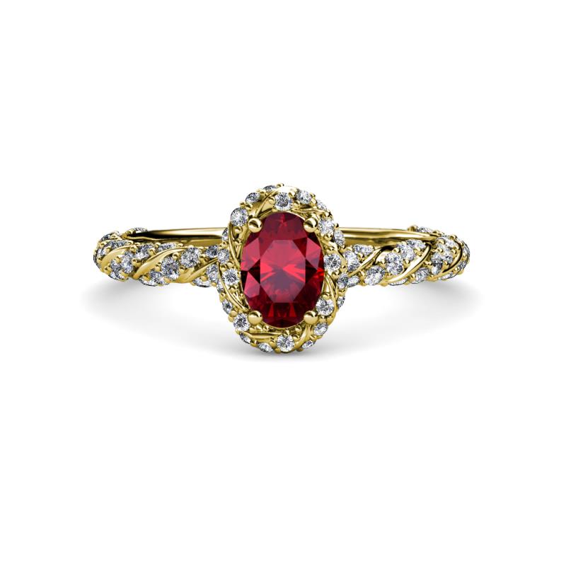 Oval Cut (7x5 mm) Ruby and Diamond Womens Halo Engagement Ring 1.65 ctw 18K Yellow Gold More Details ...