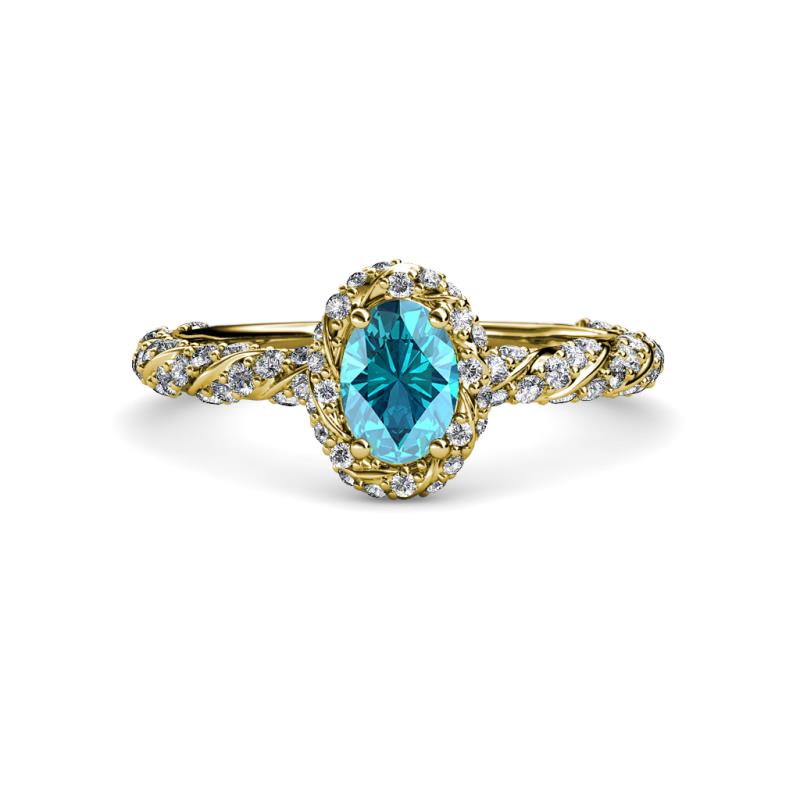 Express Your love and ask her to be yours forever with this exquisite Halo Engagement Ring featuring Center Oval Shape London Blue Topaz in a 4 Prong Setting with Halo of single row Pave Set Diamonds overlapping by swirl rope single row Pave Shank.