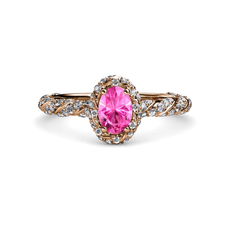 Express Your love and ask her to be yours forever with this exquisite Halo Engagement Ring featuring Center Oval Shape Pink Sapphire in a 4 Prong Setting with Halo of single row Pave Set Diamonds overlapping by swirl rope single row Pave Shank.