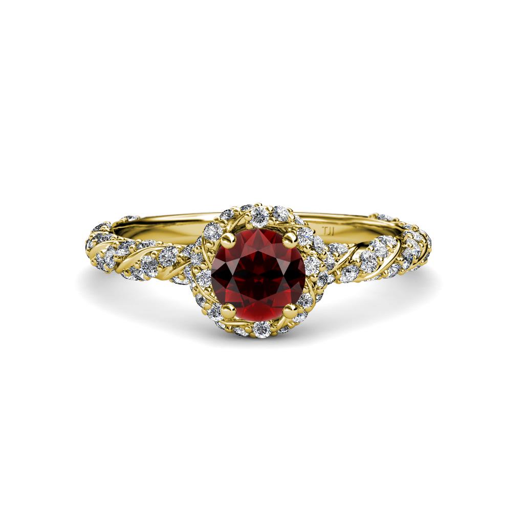 Express Your love and ask her to be yours forever with this exquisite Halo Engagement Ring featuring Center Red Garnet in a 4 Prong Setting with Halo of single row Pave Set Diamonds overlapping by swirl rope single row Pave Shank.