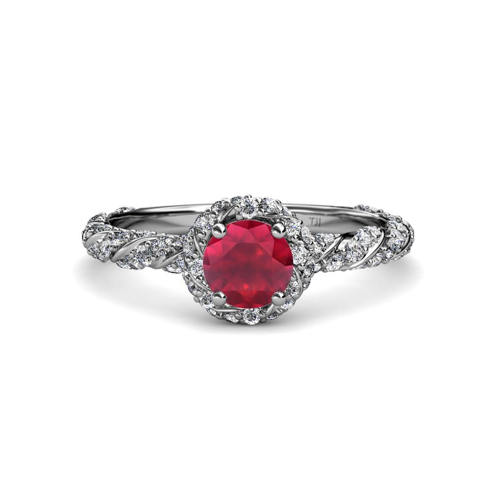 Express Your love and ask her to be yours forever with this exquisite Halo Engagement Ring featuring Center Ruby in a 4 Prong Setting with Halo of single row Pave Set Diamonds overlapping by swirl rope single row Pave Shank.