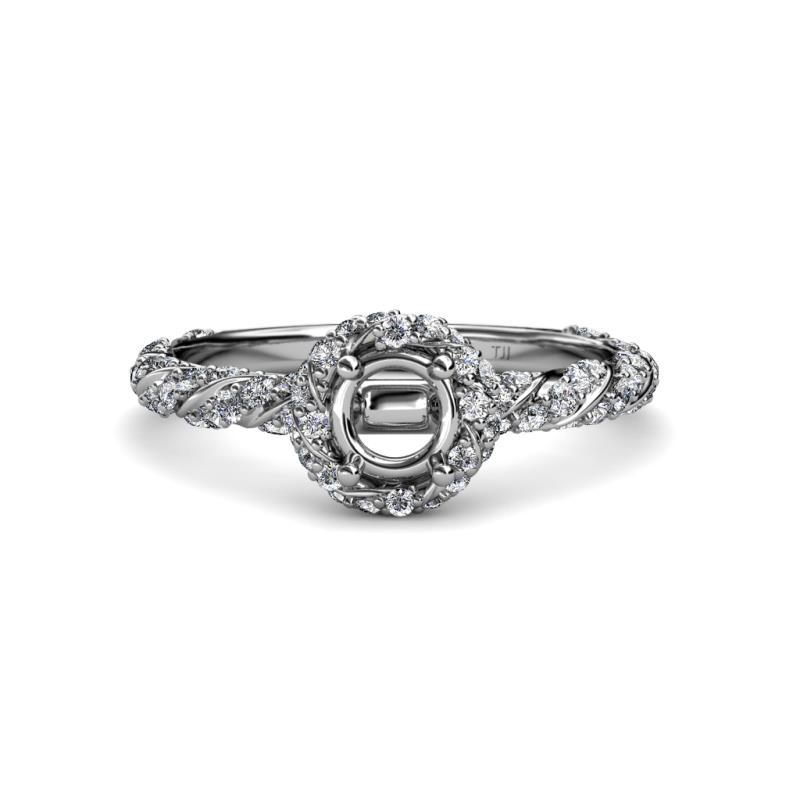 Express Your love and ask her to be yours forever with this exquisite Semi Mount Halo Engagement Ring featuring Center 4 Prong Head with Halo of single row Pave Set Diamonds overlapping by swirl rope single row Pave Shank.
