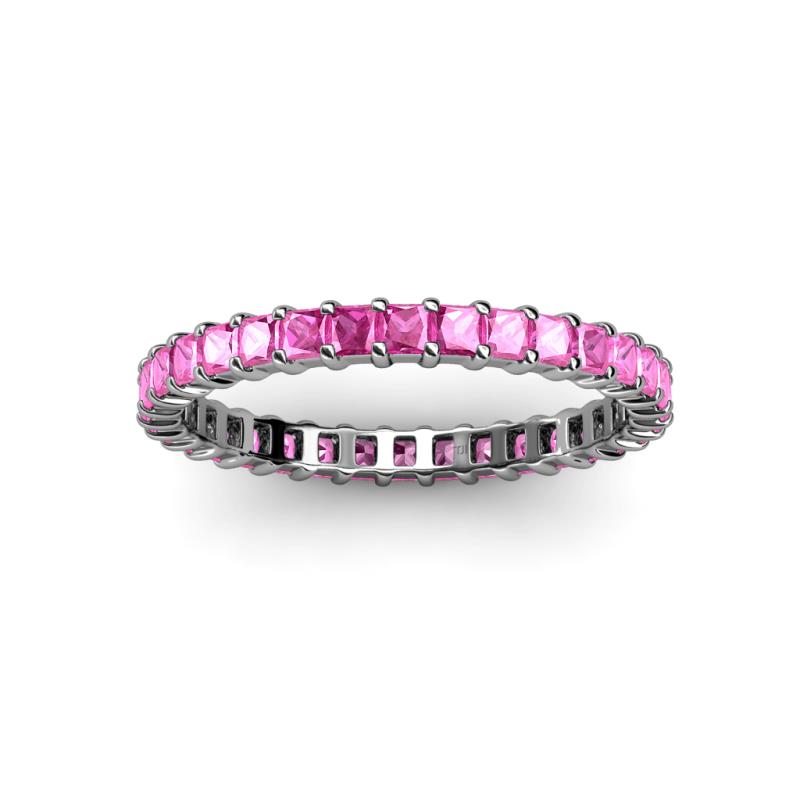 Sophisticated and mordenistic, this Pink Sapphire eternity band will give you an updated look with a classic design.This illuminating band features a perfect line of sparkling princess-cut Pink Sapphire in durable prong settings. This Princess Prong Set Eternity band is going to be her jewel of delight. *As per ring size the stone and carat total weight changes.