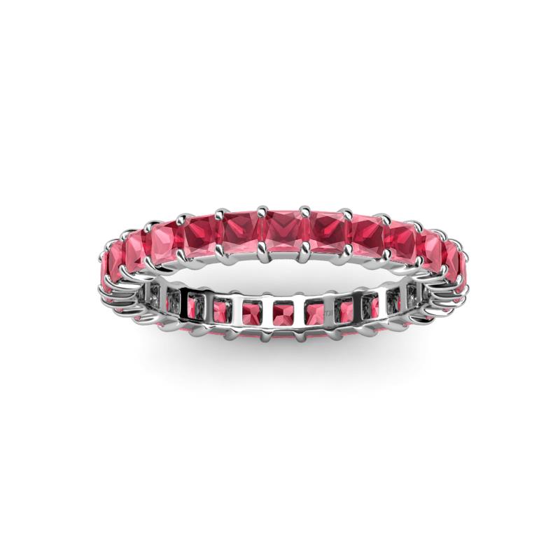 Sophisticated and mordenistic, this Rhodolite Garnet eternity band will give you an updated look with a classic design.This illuminating band features a perfect line of sparkling princess-cut Rhodolite Garnet in durable prong settings. This Princess Prong Set Eternity band is going to be her jewel of delight. *As per ring size the stone and carat total weight changes.