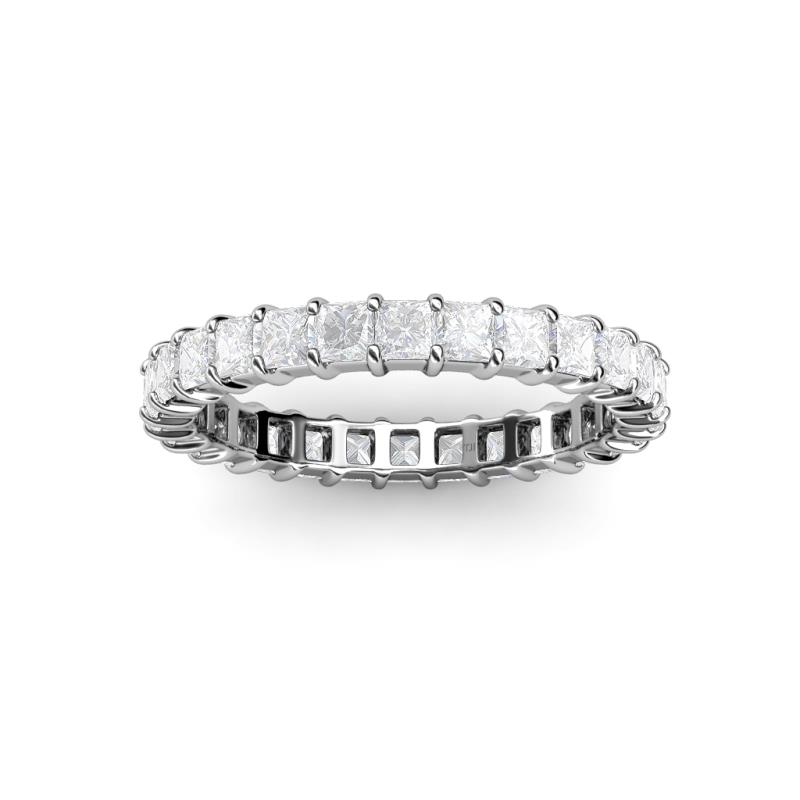 Sophisticated and mordenistic, this White Sapphire eternity band will give you an updated look with a classic design.This illuminating band features a perfect line of sparkling princess-cut White Sapphire in durable prong settings. This Princess Prong Set Eternity band is going to be her jewel of delight. *As per ring size the stone and carat total weight changes.