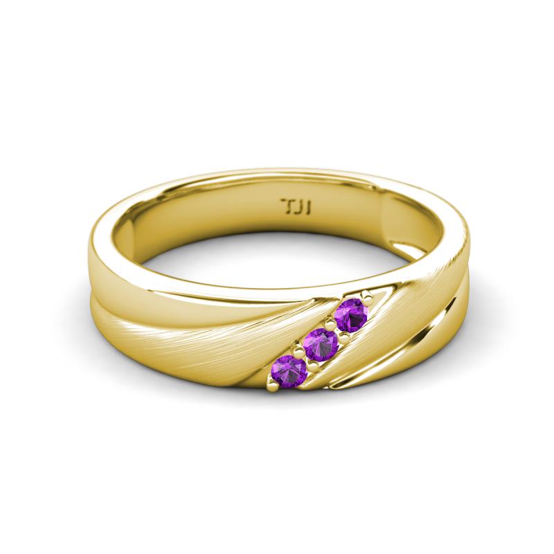 Round Amethyst (2.00 mm) Angled Brushed and Polished Finish Men Three Stone Wedding Band 18K Yellow Gold More Details ...