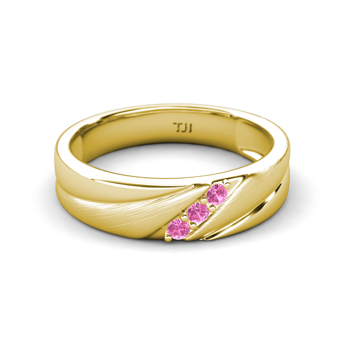 Pink Sapphire (2.00 mm) Angled Brushed and Polished Finish Men Three Stone Wedding Band in 14K Yellow Gold More Details ...