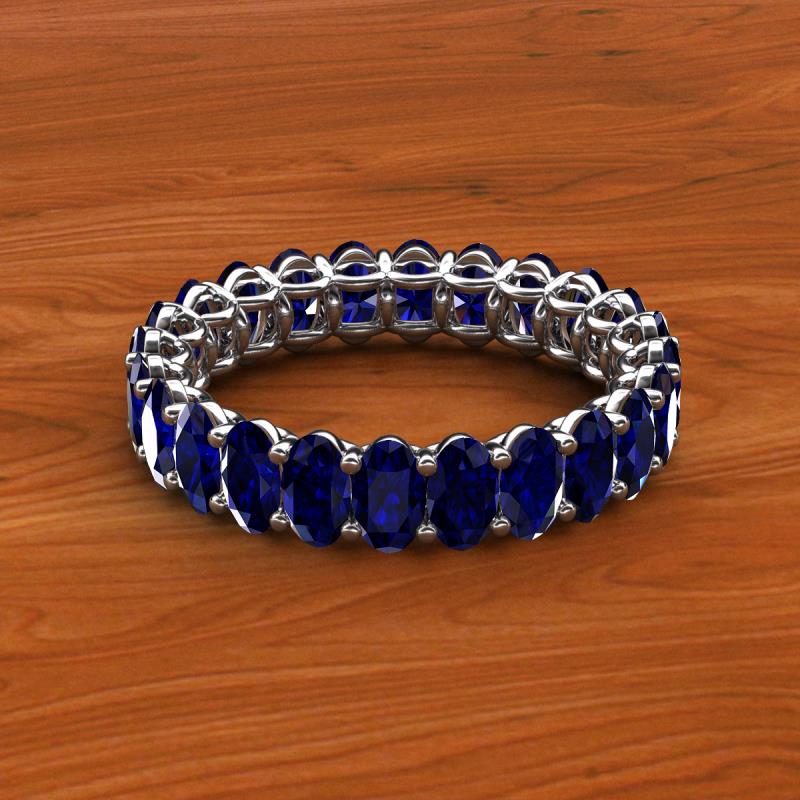 A Jewelry that is designed perfectly to make a truly special and unforgettable gift.This magnificient eternity band follows a series of Oval Shape Blue Sapphire that adds up pure glamour and excellence, with side gallery work and shared prong setting it displays a fine contemporary style look. *As per ring size the stone and carat total weight changes.