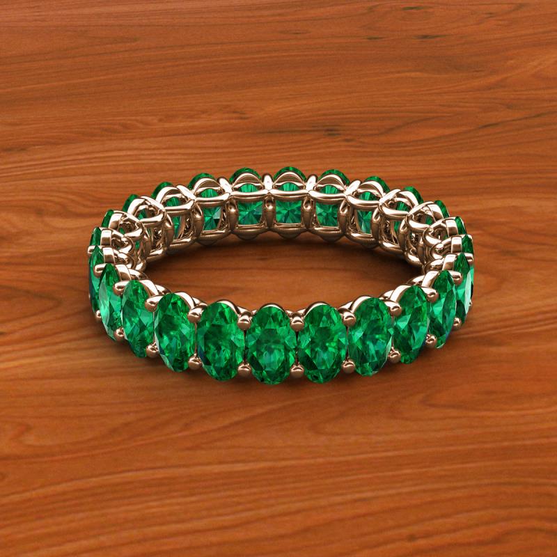 A Jewelry that is designed perfectly to make a truly special and unforgettable gift.This magnificient eternity band follows a series of Oval Shape Emerald that adds up pure glamour and excellence, with side gallery work and shared prong setting it displays a fine contemporary style look. *As per ring size the stone and carat total weight changes.