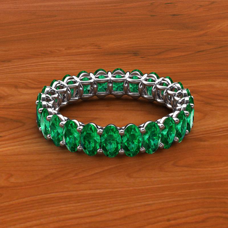 A Jewelry that is designed perfectly to make a truly special and unforgettable gift.This magnificient eternity band follows a series of Oval Shape Emerald that adds up pure glamour and excellence, with side gallery work and shared prong setting it displays a fine contemporary style look. *As per ring size the stone and carat total weight changes.