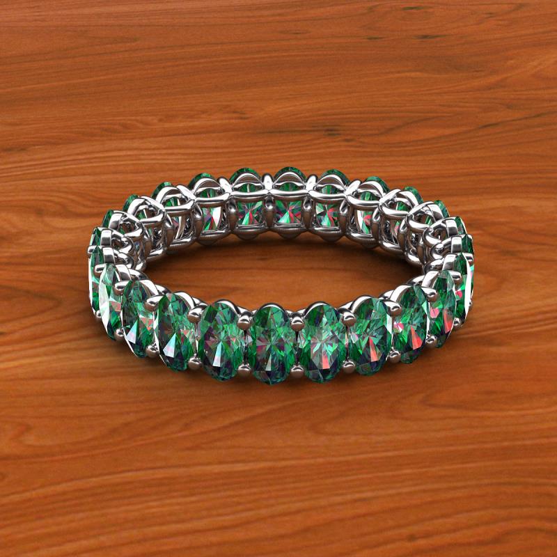 A Jewelry that is designed perfectly to make a truly special and unforgettable gift.This magnificient eternity band follows a series of Oval Shape Lab Created Alexandrite that adds up pure glamour and excellence, with side gallery work and shared prong setting it displays a fine contemporary style look. *As per ring size the stone and carat total weight changes.