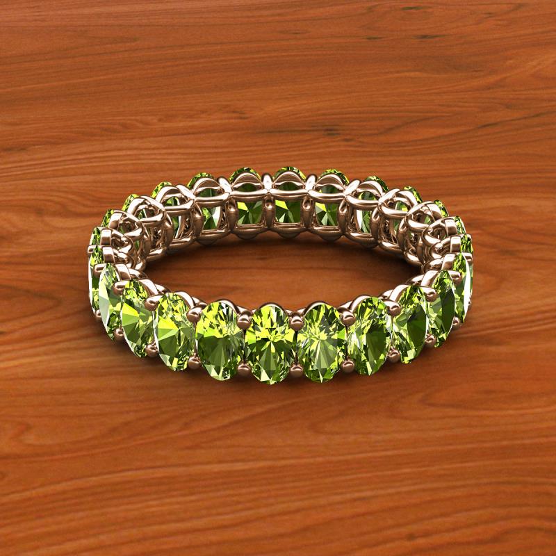 A Jewelry that is designed perfectly to make a truly special and unforgettable gift.This magnificient eternity band follows a series of Oval Shape Peridot that adds up pure glamour and excellence, with side gallery work and shared prong setting it displays a fine contemporary style look. *As per ring size the stone and carat total weight changes.
