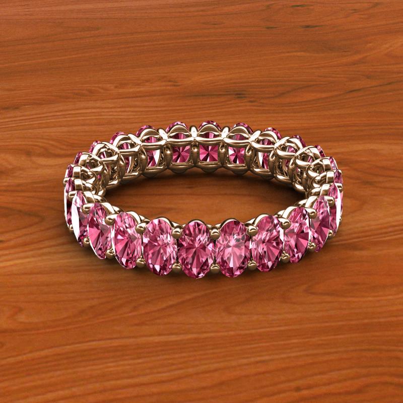 A Jewelry that is designed perfectly to make a truly special and unforgettable gift.This magnificient eternity band follows a series of Oval Shape Pink Tourmaline that adds up pure glamour and excellence, with side gallery work and shared prong setting it displays a fine contemporary style look. *As per ring size the stone and carat total weight changes.