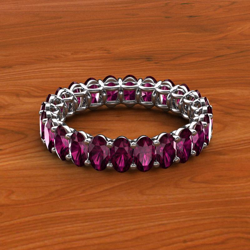 A Jewelry that is designed perfectly to make a truly special and unforgettable gift.This magnificient eternity band follows a series of Oval Shape Rhodolite Garnet that adds up pure glamour and excellence, with side gallery work and shared prong setting it displays a fine contemporary style look. *As per ring size the stone and carat total weight changes.