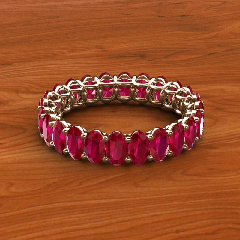 A Jewelry that is designed perfectly to make a truly special and unforgettable gift.This magnificient eternity band follows a series of Oval Shape Ruby that adds up pure glamour and excellence, with side gallery work and shared prong setting it displays a fine contemporary style look. *As per ring size the stone and carat total weight changes.