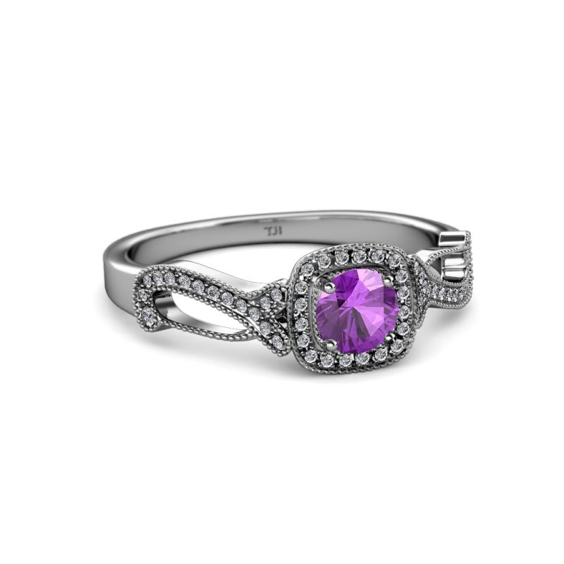 1.12 ctw Amethyst Round (6.50 mm) & Natural Diamond Round (1.10 mm) Swirl Halo Engagement Ring with Milgrain Work in 14K White Gold More Details ...