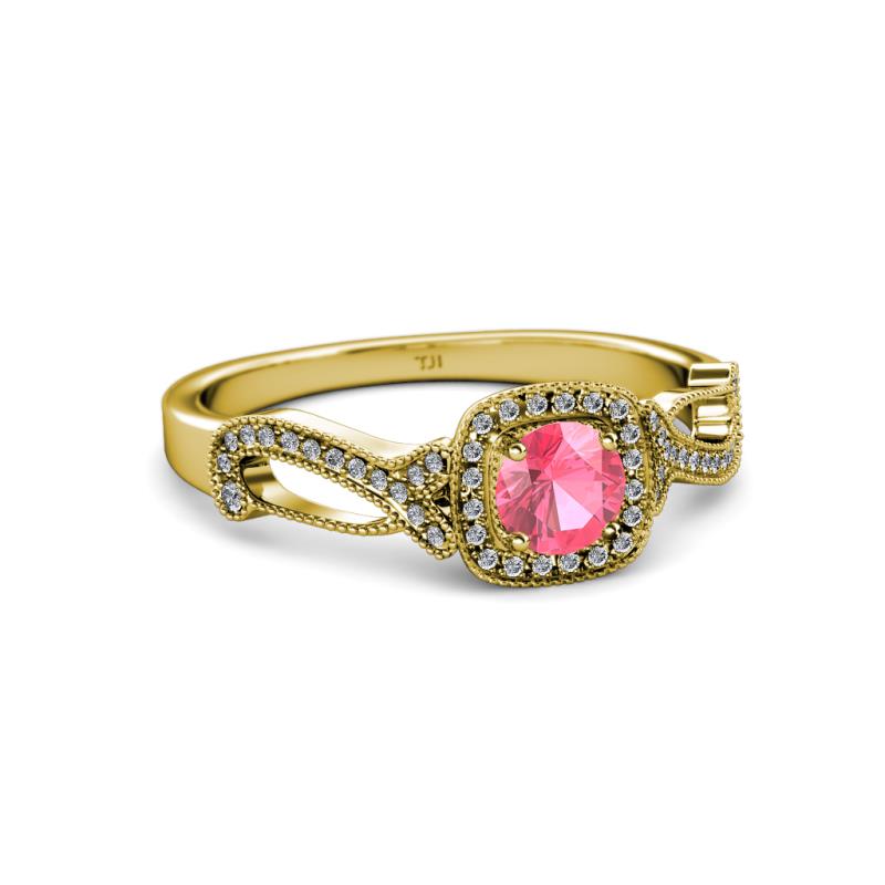 This Milgrain Work Swirl Engagement Ring of 1.12 ctw is a classic beauty that will surely make her say yes, surrounding the Center Pink Tourmaline by Cushion Frame Halo of Natural Diamonds along with diamonds surrounded on either side of Center Stone and Yellow Gold Gallery Work below the Head.