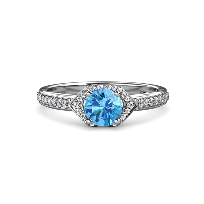 This Glorious Engagement Ring has 4 Prong Round Center Blue Topaz with flared shoulders and single row collar along with single row shank of Pave Set Diamonds is a perfect symbol of heavenly beauty and timeless elegance.