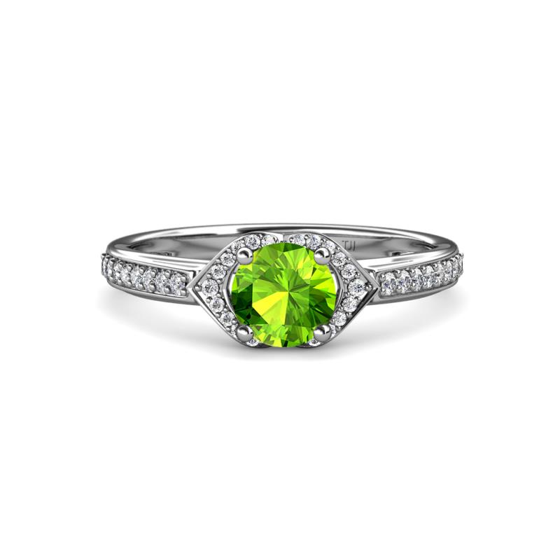 This Glorious Engagement Ring has 4 Prong Round Center Peridot with flared shoulders and single row collar along with single row shank of Pave Set Diamonds is a perfect symbol of heavenly beauty and timeless elegance.