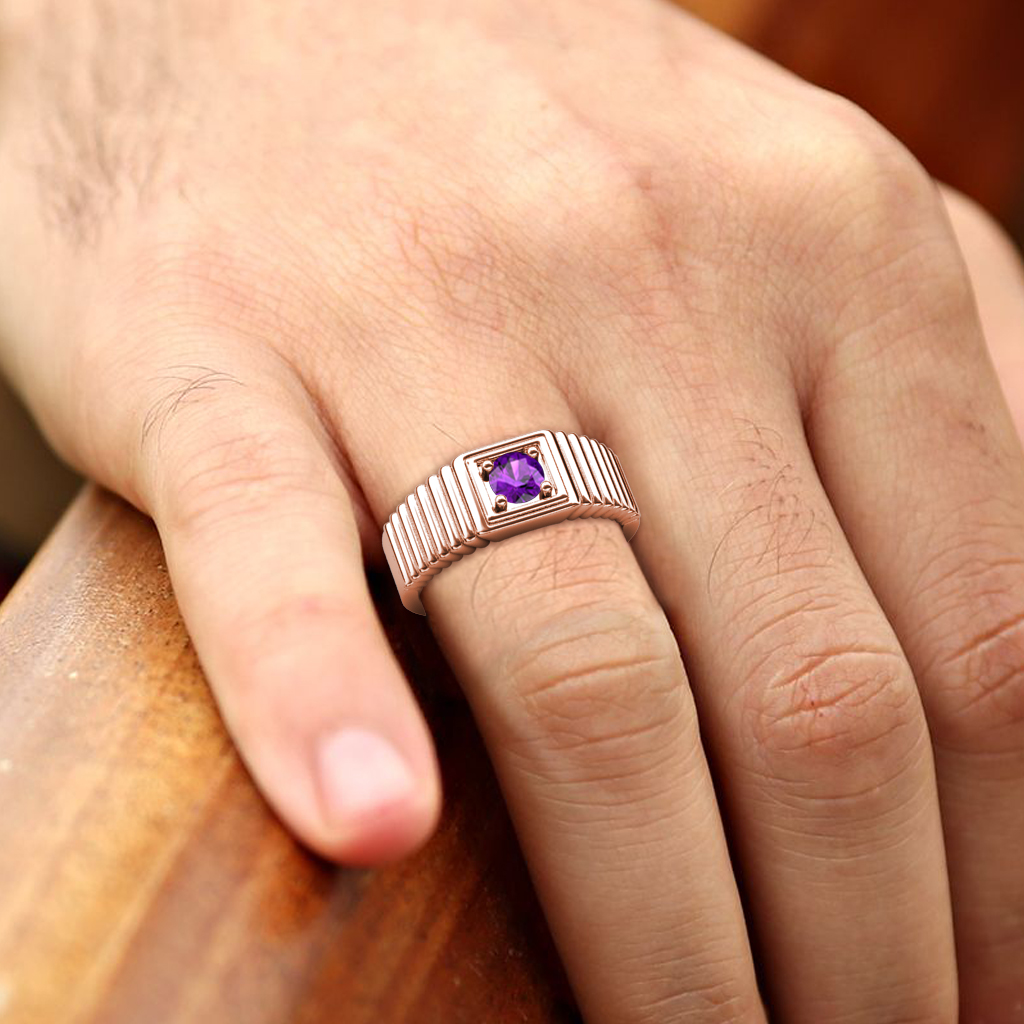 0.40 ct Amethyst Ribbed Shank Solitaire Prong Set Men Band in 10K Rose Gold More Details ...
