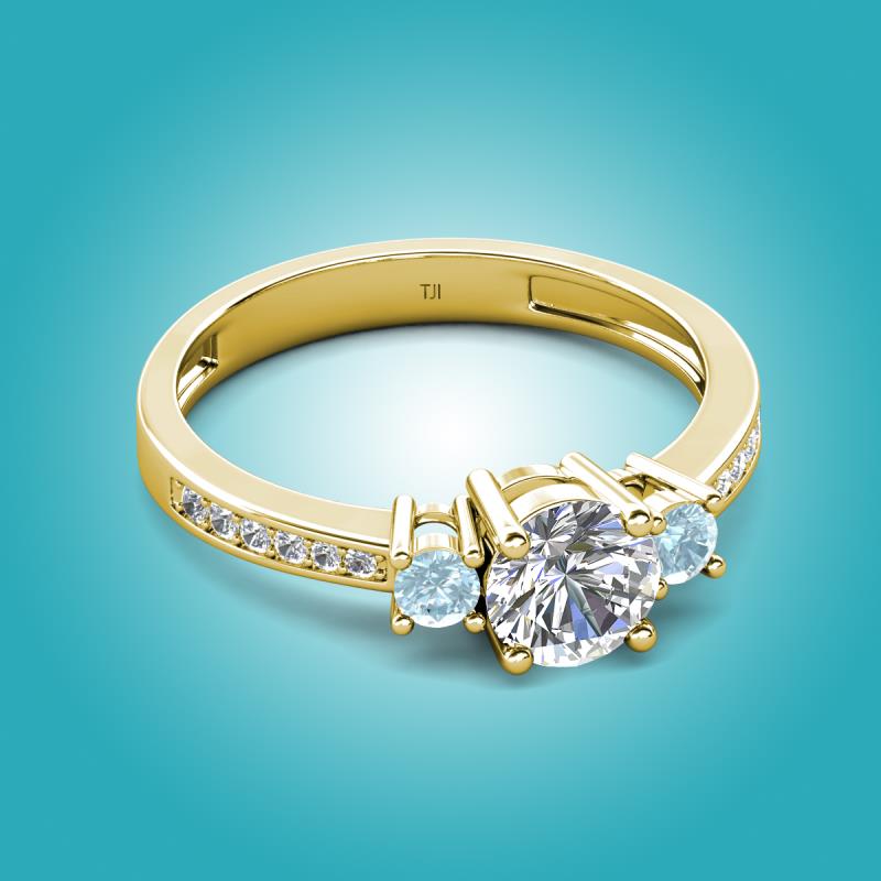 GIA Certified Three Stone Round Natural Diamond and Aquamarine accented Diamond Engagement Ring in 18K Yellow Gold More Details ...