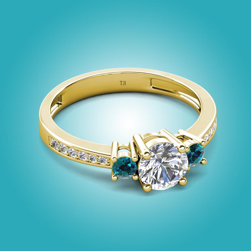 Symbolizing your beautiful past, present and future with this Three Stone Engagement ring of 1.34 ctw GIA Certified Round Natural Diamond and Blue Diamond accented Side Natural Diamond on Shank set in a Prong setting.