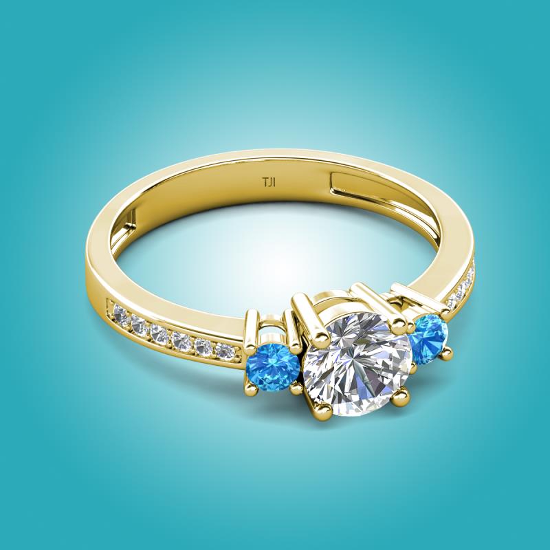 GIA Certified Three Stone Round Natural Diamond and Blue Topaz accented Diamond Engagement Ring in 18K Yellow Gold More Details ...