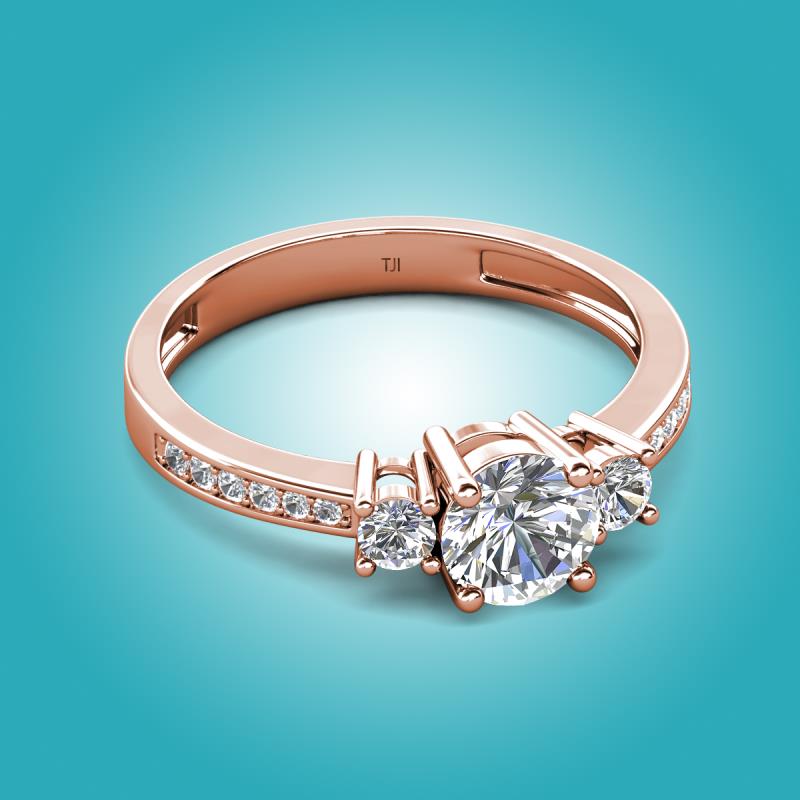 GIA Certified Three Stone Round Natural Diamond and Moissanite accented Diamond Engagement Ring in 18K Rose Gold More Details ...