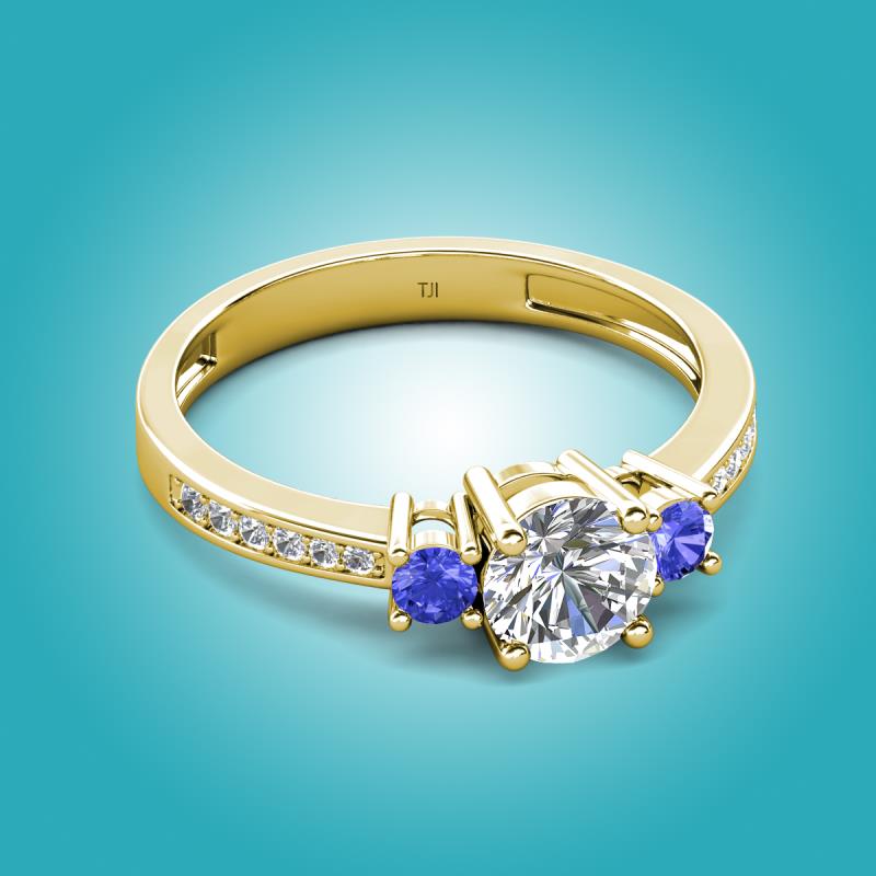 GIA Certified Three Stone Round Natural Diamond and Tanzanite accented Diamond Engagement Ring in 18K Yellow Gold More Details ...
