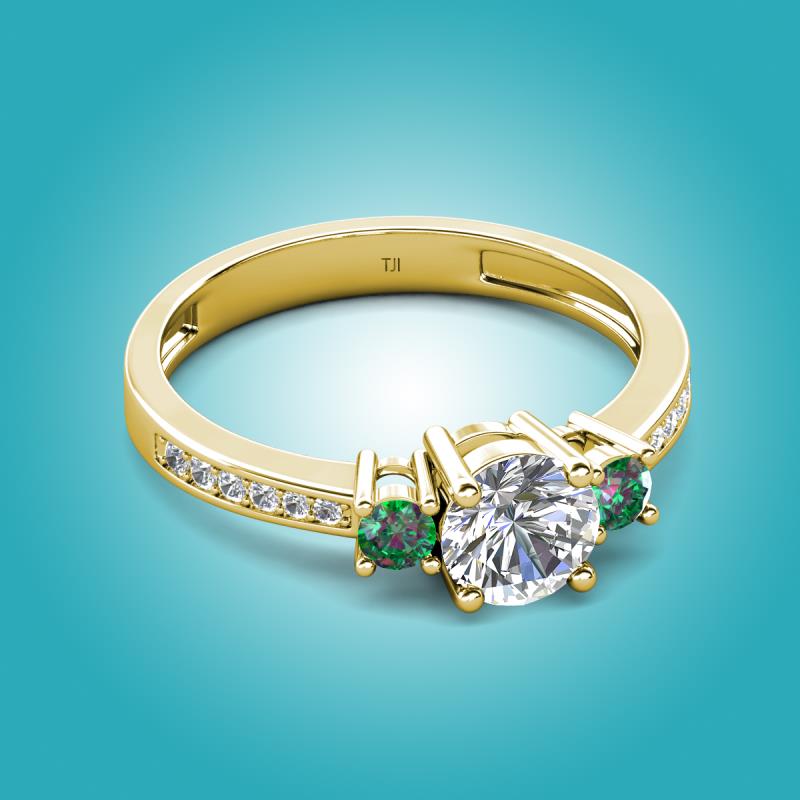 GIA Certified Three Stone Round Natural Diamond and Lab Created Alexandrite accented Diamond Engagement Ring in 18K Yellow Gold More Details ...