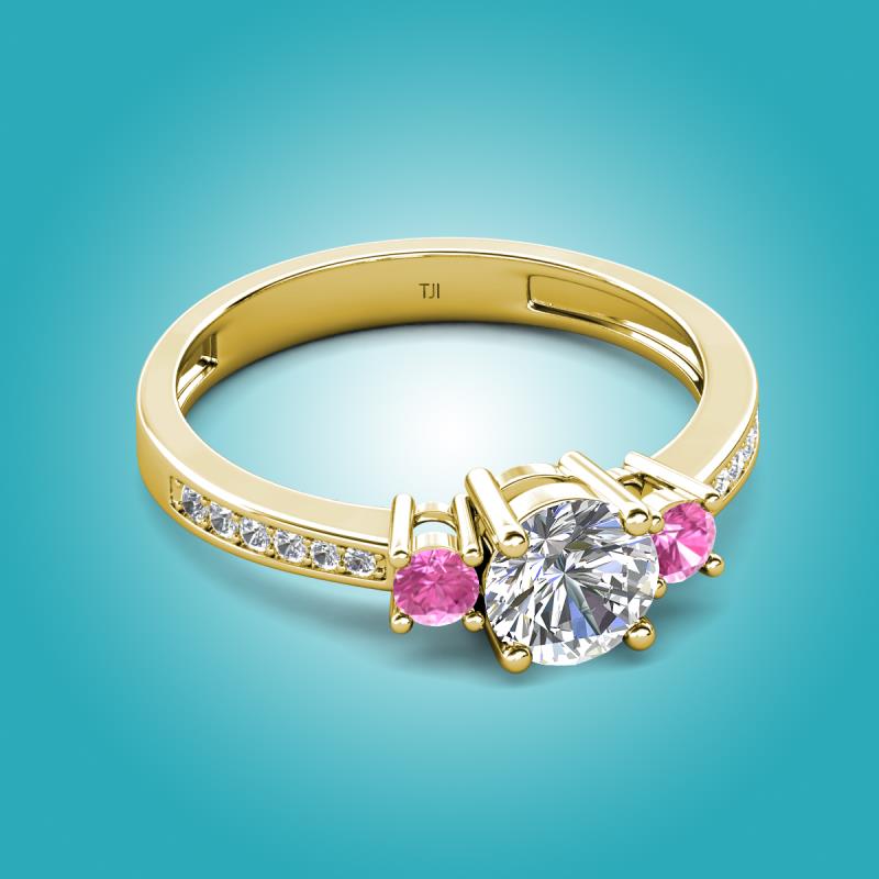 GIA Certified Three Stone Round Natural Diamond and Pink Sapphire accented Diamond Engagement Ring in 14K Yellow Gold More Details ...