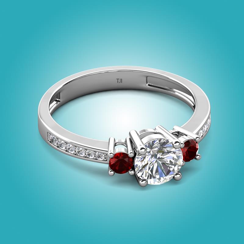 Symbolizing your beautiful past, present and future with this Three Stone Engagement ring of 1.38 ctw GIA Certified Round Natural Diamond and Red Garnet accented Side Natural Diamond on Shank set in a Prong setting.