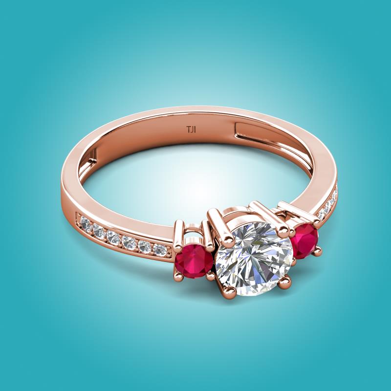 GIA Certified Three Stone Round Natural Diamond and Ruby accented Diamond Engagement Ring in 14K Rose Gold More Details ...