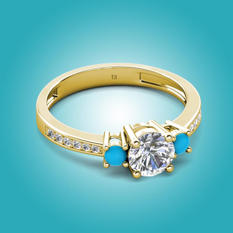 GIA Certified Three Stone Round Natural Diamond and Turquoise accented Diamond Engagement Ring in 14K Yellow Gold More Details ...
