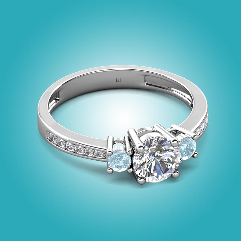 Symbolizing your beautiful past, present and future with this Three Stone Engagement ring of 1.30 ctw IGI Certified Round Lab Grown Diamond and Aquamarine accented Side Natural Diamond on Shank set in a Prong setting.