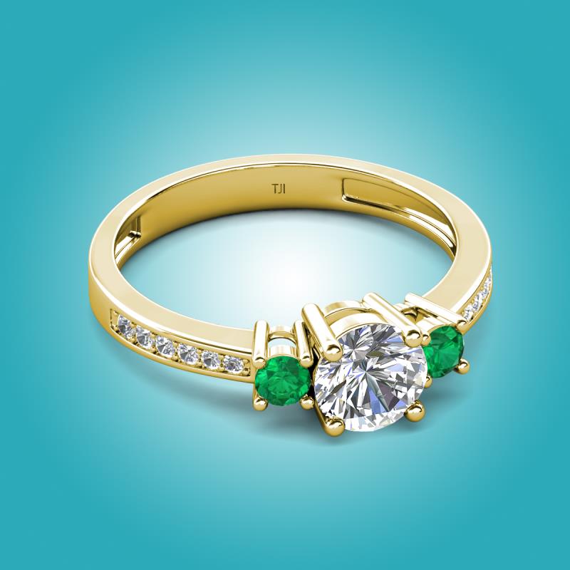 IGI Certified Three Stone Round Lab Grown Diamond and Emerald accented Diamond Engagement Ring in 14K Yellow Gold More Details ...
