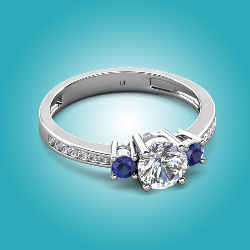 Symbolizing your beautiful past, present and future with this Three Stone Engagement ring of 1.30 ctw IGI Certified Round Lab Grown Diamond and Iolite accented Side Natural Diamond on Shank set in a Prong setting.