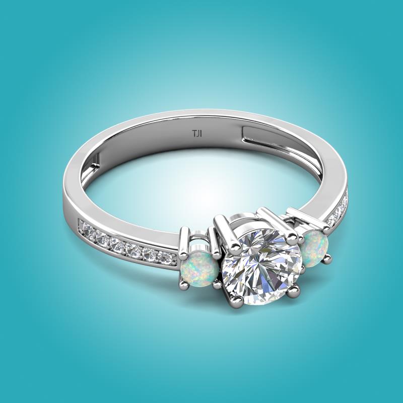 Symbolizing your beautiful past, present and future with this Three Stone Engagement ring of 1.26 ctw IGI Certified Round Lab Grown Diamond and Opal accented Side Natural Diamond on Shank set in a Prong setting.