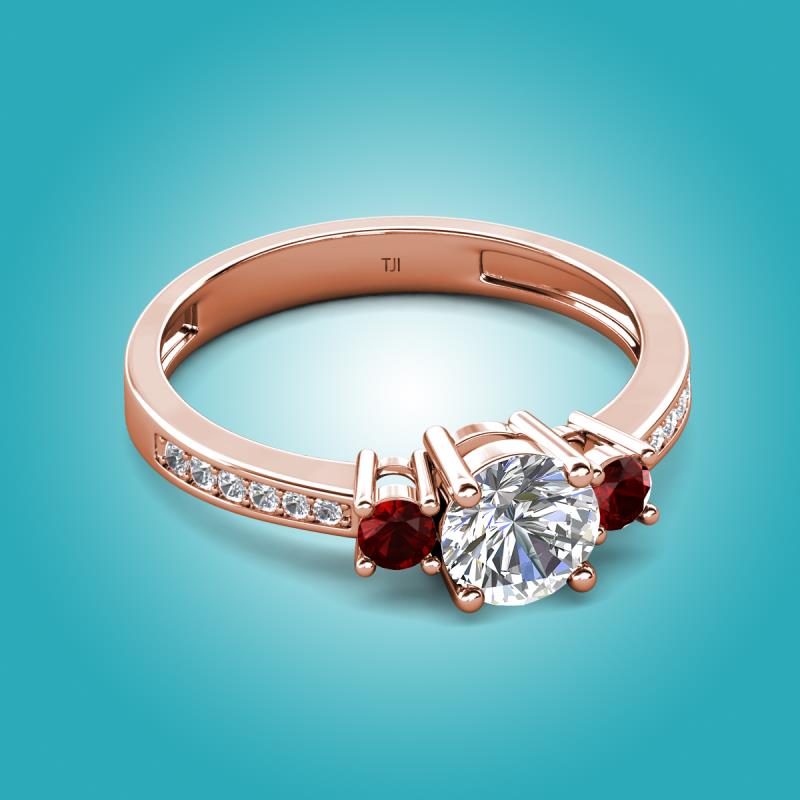 IGI Certified Three Stone Round Lab Grown Diamond and Red Garnet accented Diamond Engagement Ring in 18K Rose Gold More Details ...